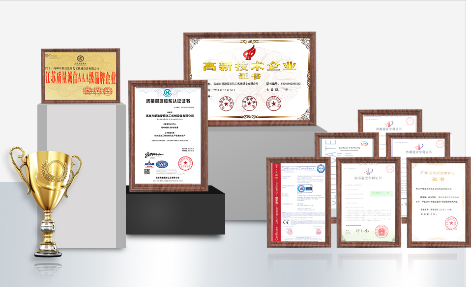榮獲30余項(xiàng)實(shí)用新型和外觀專(zhuān)利證書(shū),乳化機(jī)/灌裝機(jī)等多款產(chǎn)品被認(rèn)定為高新技術(shù)產(chǎn)品